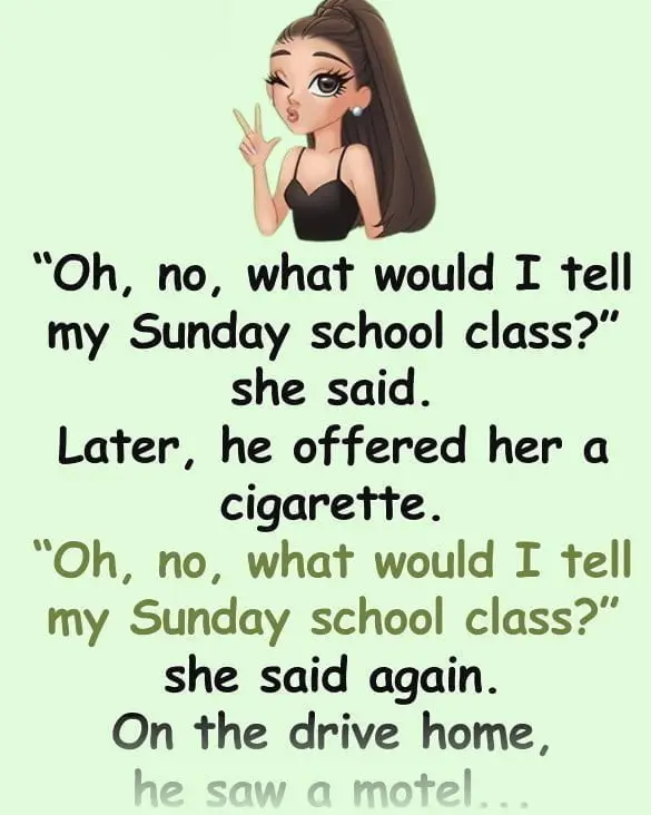 “Oh, no, what would I tell my Sunday school class?” she said.Later, he offered her a cigarette.“Oh, no, what would…