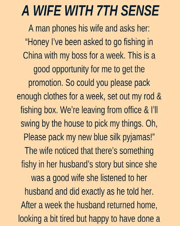 A man phones his wife and asks her: “Honey I’ve been asked to go fishing in China with my boss…