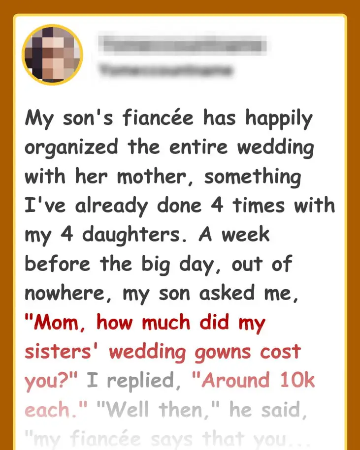 You’ve never loved me like my sisters, and now you’re revealing your true colors! And you know what?” he added, “I don’t want you at my wedding! Just stay away!” I thought he was joking, but he seems to be completely serious.