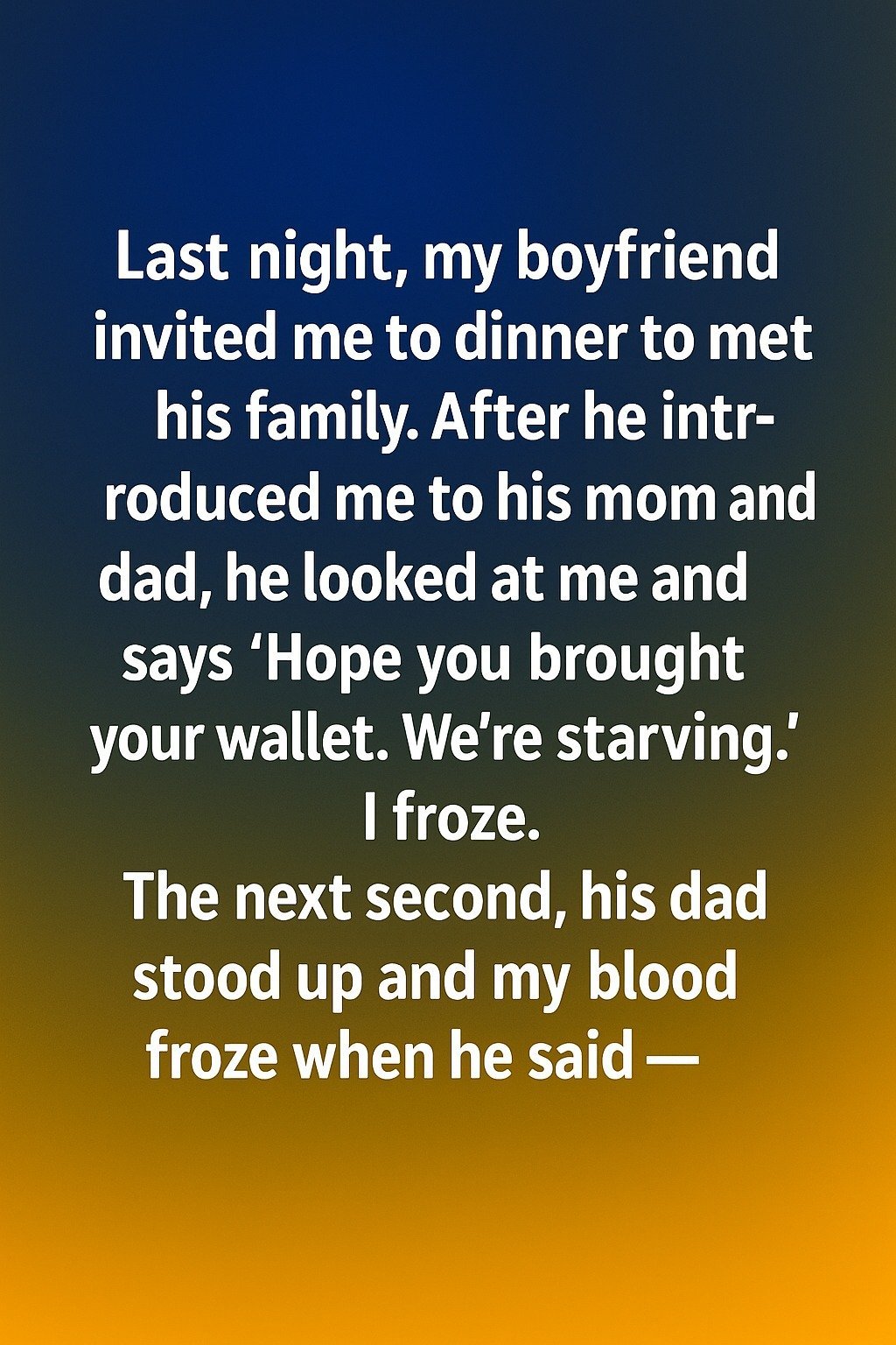 The entire table burst into laughter, and I realized they were simply trying to break the ice, though their humor was far more intense than I expected. My face must have shown every emotion at once because my boyfriend quickly reached for my hand and assured me they meant no harm. Once the moment passed, his mom invited us to sit, eager to start dinner.