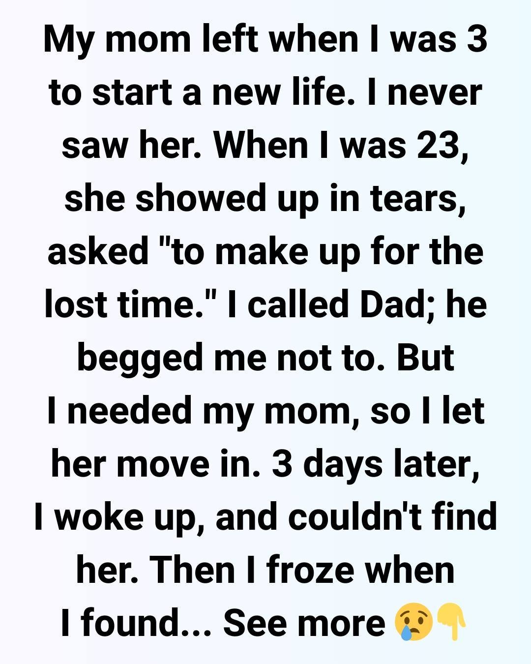 My mom left when I was 3 to “start a new life.” Growing up, it was just me and Dad. He worked himself to the bone to keep us afloat, and I always told myself I didn’t miss her because I didn’t even remember her. But somewhere deep down, I carried this ache.