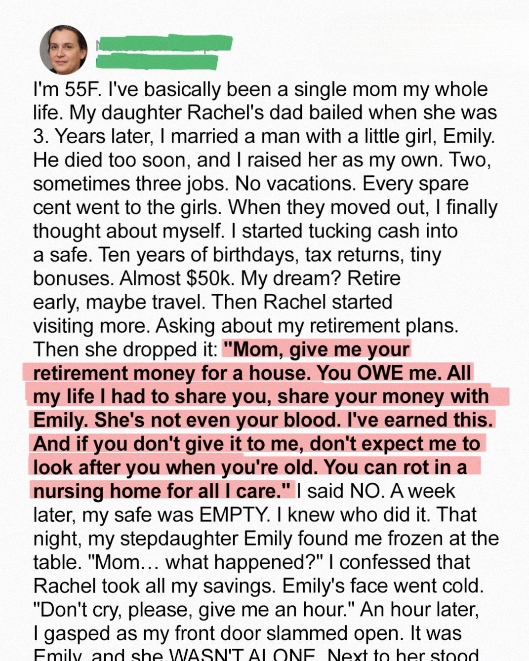 One spring afternoon, Rachel began visiting more often. She laughed, smiled, and even brought my favorite coffee, but soon her questions turned sharp. She asked about my retirement, hinted at me downsizing, and then, one night, demanded I give her my savings for a down payment on a house.