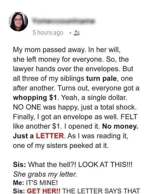 When I arrived, Samira immediately presented a will naming her as the sole heir, claiming her care entitled her to everything. I couldn’t bear to fight in that moment and instead went to speak with Mom’s doctor. To my surprise, he gave me an envelope Mom had left for me.