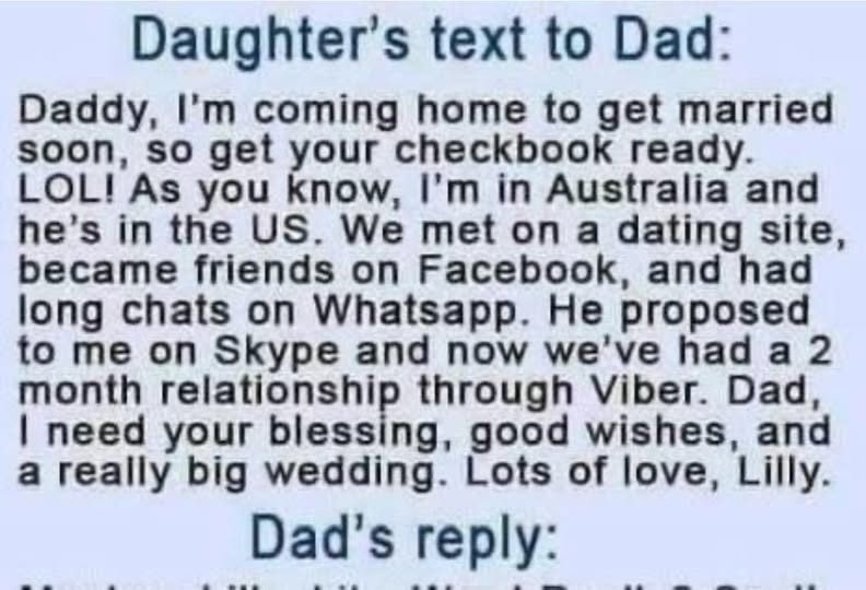“Daddy, I’m coming home to get married soon, so get your checkbook ready. LOL!”