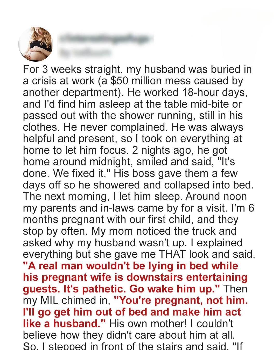 My mother-in-law added sharply, “A real man wouldn’t be lying in bed while his pregnant wife entertains guests.”