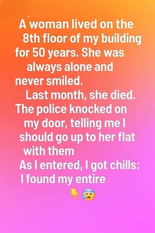 For fifty years, a woman lived on the eighth floor of my building. She never smiled and was always by herself. She died last month.