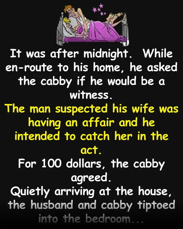 Quietly arriving at the house, the husband and cabby tiptoed into the bedroom.