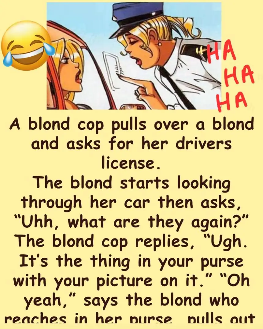 The blond cop replies, “Ugh. It’s the thing in your purse with your picture on it.” “Oh yeah,” says the blond who reaches in her purse, pulls out a compact mirror, and hands it over.