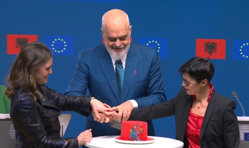 Festë me tortë e verë në Bruksel, Rama surprizon Marta Kos dhe ministren daneze! Kryeministri: Do të ishte e padrejtë të fryja qiririn pa…