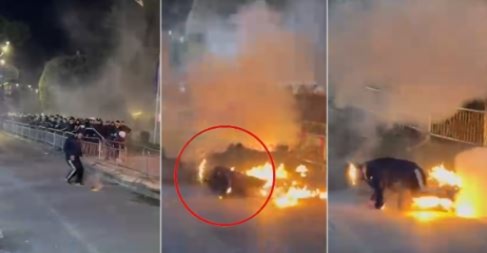 Incident i frikshëm/ Protestuesit i plas molotovi tek këmbët, merr flakë dhe largohet me vrap