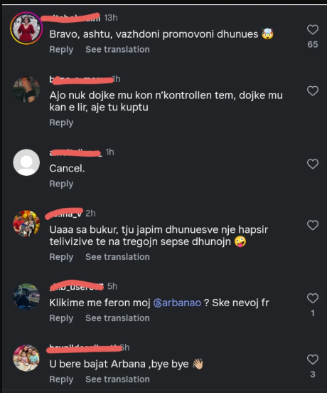 Komentet në rrjet ishin të shumta dhe të ashpra. Disa prej tyre ishin: “Tmerr, dhunuesit i jepet hapësirë publike,” “E paske vendos këtë vit të promovosh tradhtarët dhe dhunuesit,” dhe “Arbana paska marrë listën e dhunuesve në polici dhe paska vendose me i intervistu.”