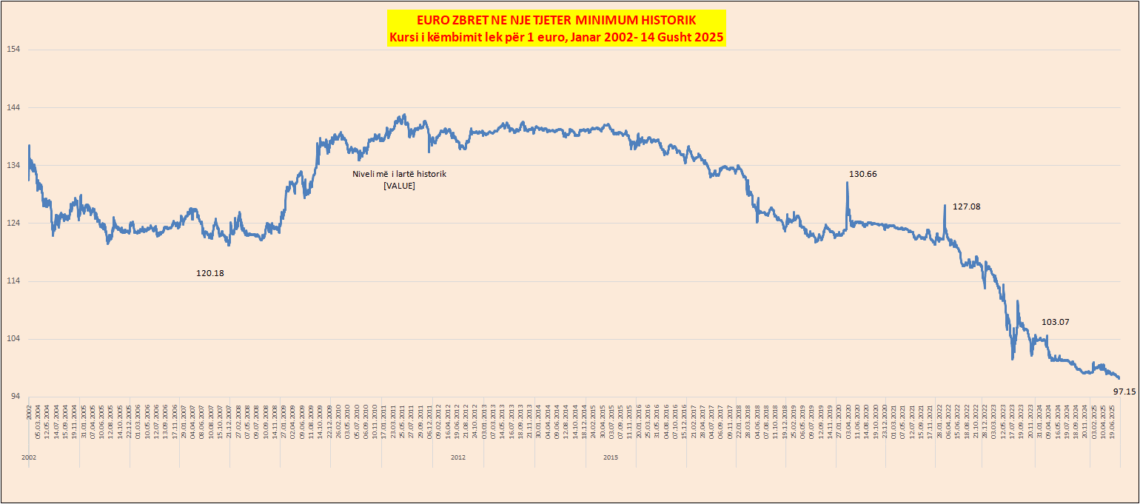 Rënia e Euros në kursin e këmbimit me Lekun po thyen rekorde të reja. Sipas kursit zyrtar të këmbimit të Bankës së Shqipërisë, të enjten monedha europiane u këmbye me 97.15 lekë, niveli më i ulët i shënuar ndonjëherë.