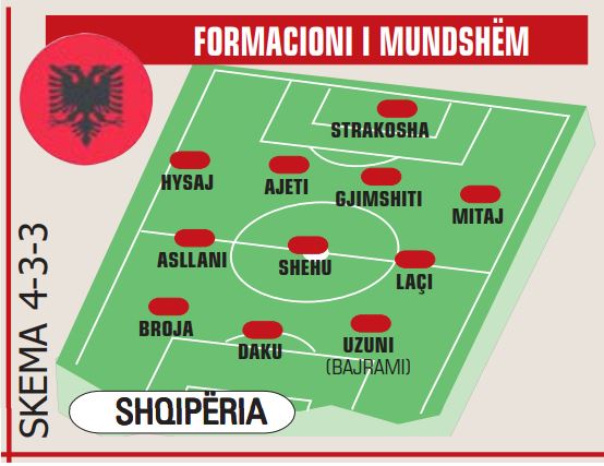 Në portë mbetet titullar Strakosha, i cili do të ketë në mbrojtje Hysajn nga e djathta e Mitajn nga e majta, teksa në qendër do të jetë dyshja Ajeti-Gjimshiti.