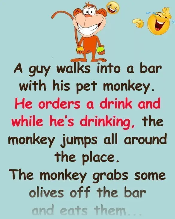 He orders a drink and while he’s drinking, the monkey jumps all around the place.