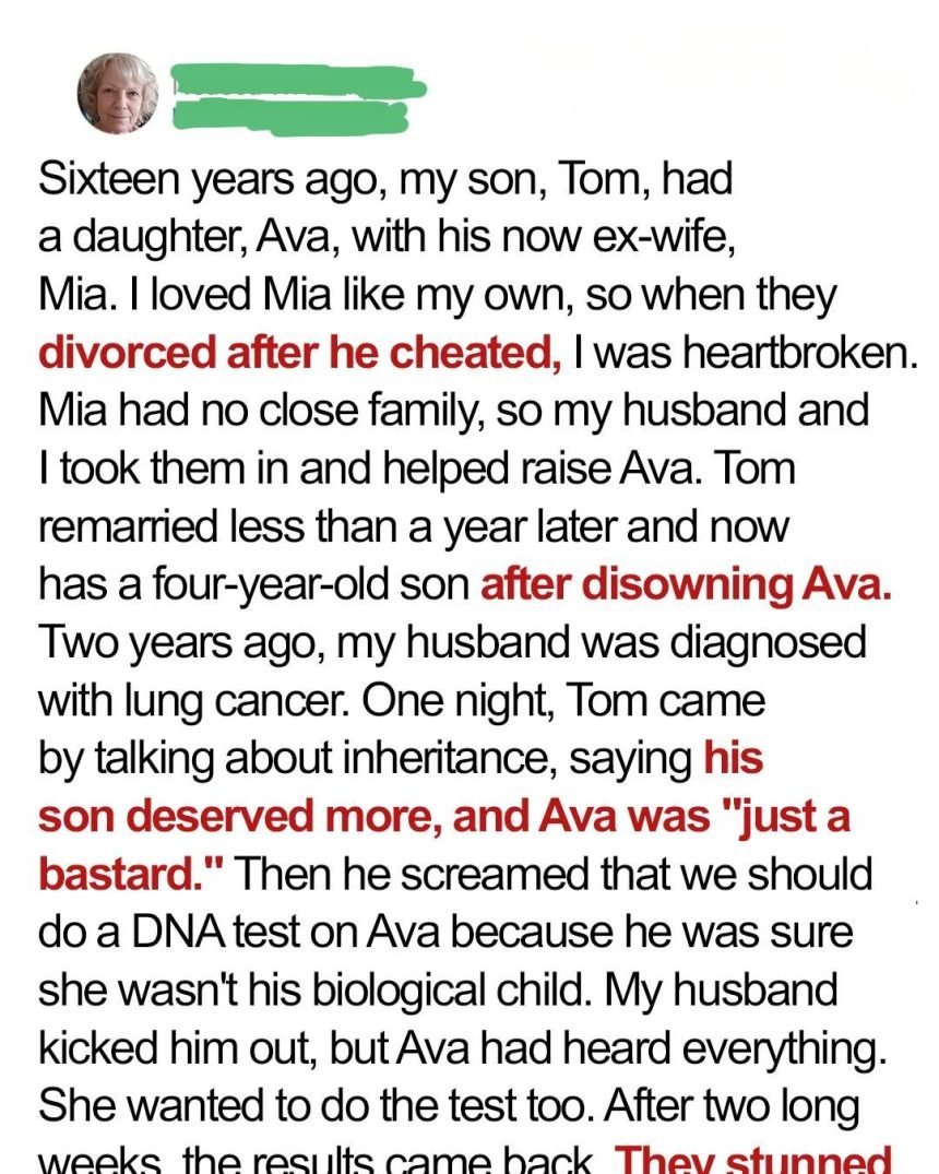 When my son turned his back on his daughter, my husband and I stepped in without hesitation. Sixteen years later, he showed up demanding a DNA test — and what followed left us all shaken. Tom and Mia had Ava when they were young, but after cheating and remarrying, Tom disowned his little girl, insisting she wasn’t his.
