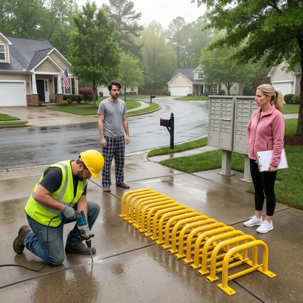A white work truck, hazard lights flashing, was backed halfway into my driveway. A guy in a neon vest and ear protection was kneeling on my concrete, a rotary hammer pounding into it. Next to him, lined up like soldiers, were bright yellow parking bars—twenty-two of them, all in a row, waiting for installation.