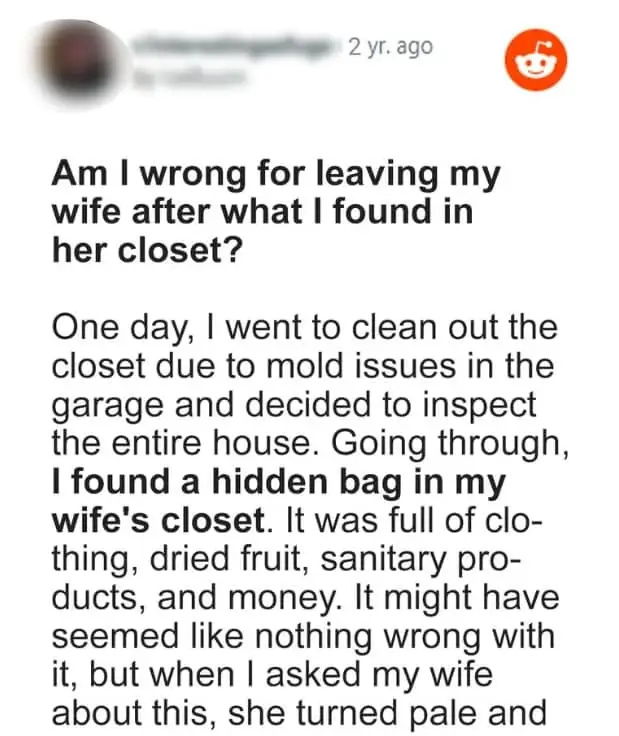 The man was cleaning the closet when he found a gym bag filled with clothing, dried fruit, sanitary products, and money. Confused by the discovery, the man asked his wife what it was for.