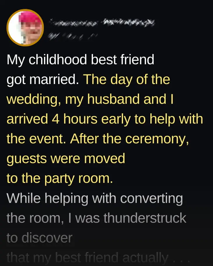“My childhood best friend got married last weekend. I was overjoyed and thrilled to be there to support her on her special day.Trashy things in our relationship began right away.