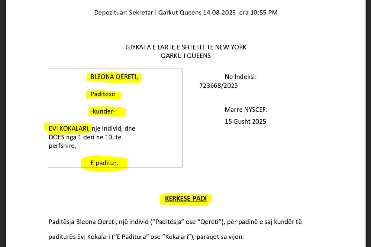 Në padinë e depozituar në Gjykatën e Lartë të Nju Jorkut në mes të muajit gusht 2025, avokatët e Bleona Qerrestit shkruajnë se Kokalari publikoi një sërë deklaratash të rreme duke pretenduar se “bazohen në gjëra që Bleona vetë më ka thënë”.