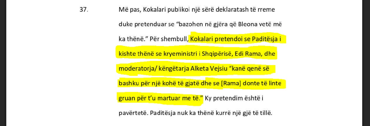 “Për shembull, Kokalari pretendoi se paditësja i kishte thënë se kryeministri i Shqipërisë, Edi Rama, dhe moderatorja/ këngëtarja Alketa Vejsiu ‘kanë qenë së bashku për një kohë të gjatë dhe se [Rama] donte të linte gruan për t’u martuar me të’. Ky pretendim është i pavërtetë.