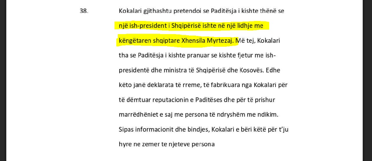 VoxNews ka analizuar akt-padinë, ku avokatët e Bleona Qerretit shkruajnë se; “Kokalari gjithashtu pretendoi se paditësja i kishte thënë se një ish-president i Shqipërisë ishte në një lidhje me këngëtaren shqiptare Xhensila Myrtezaj. Më tej, Kokalari tha se paditësja i kishte pranuar se kishte fjetur me ish-presidentë dhe ministra të Shqipërisë dhe Kosovës. Edhe këto janë deklarata të rreme, të fabrikuara nga Kokalari për të dëmtuar reputacionin e paditëses dhe për të prishur marrëdhëniet e saj me persona të ndryshëm me ndikim.