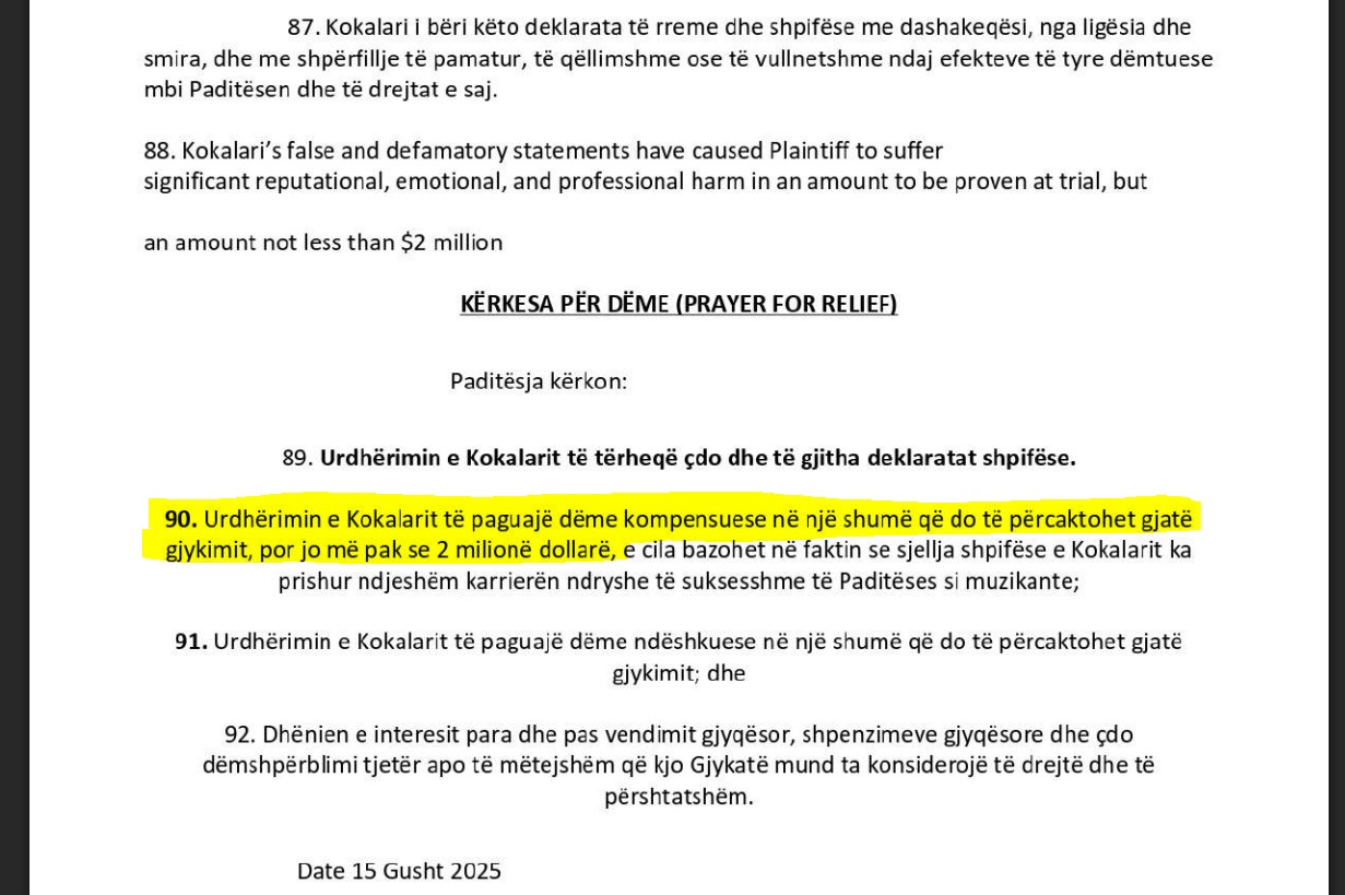 Avokatët shkruajnë se kërkojnë nga gjykata urdhërimin e Kokalarit të paguajë dëme ndëshkuese në një shumë që do të përcaktohet gjatë gjykimit dhe dhënien e interesit para dhe pas vendimit gjyqësor, shpenzimeve gjyqësore dhe çdo dëmshpërblimi tjetër apo të mëtejshëm që kjo gjykatë mund ta konsiderojë të drejtë dhe të përshtatshëm. /Voxnews