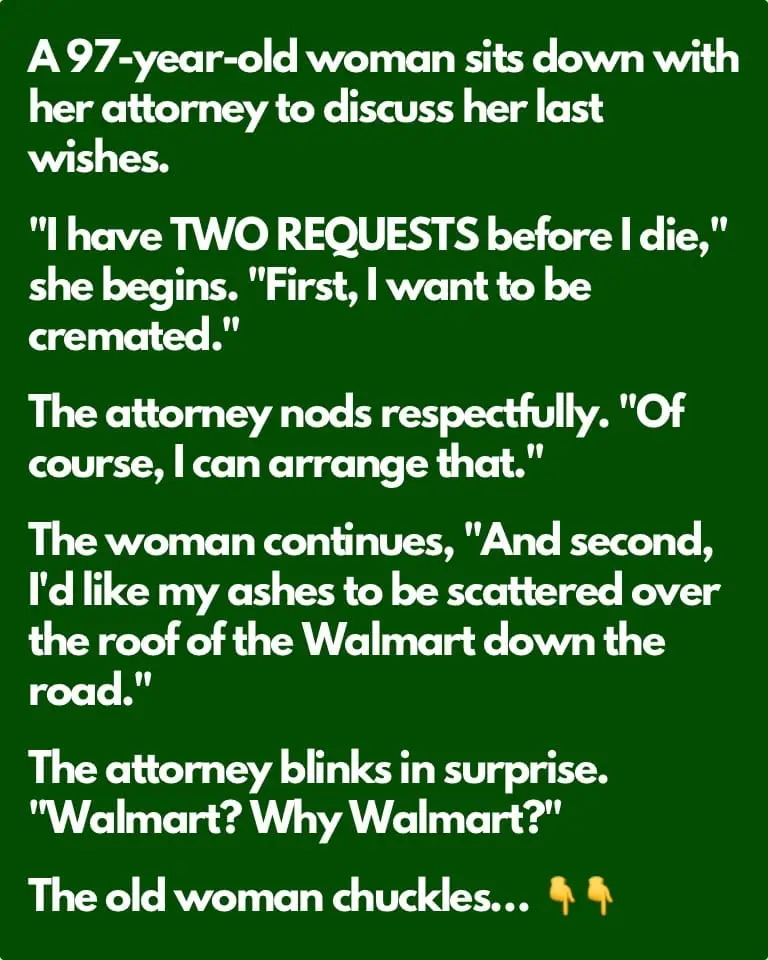 The woman continues, “And second, I’d like my ashes to be scattered over the roof of the Walmart down the road.”