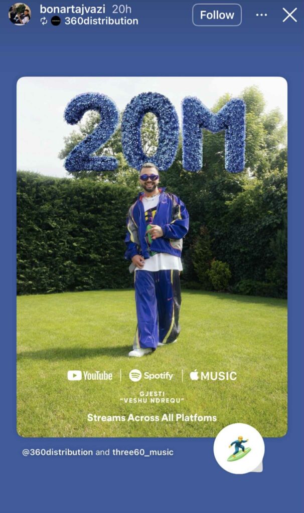 Këtë herë, Bonarti njoftoi se projekti muzikor i Gjestit, “Veshu ndrequ”, ka arritur plot 20 milionë klikime, një sukses i madh për artistin pejan.