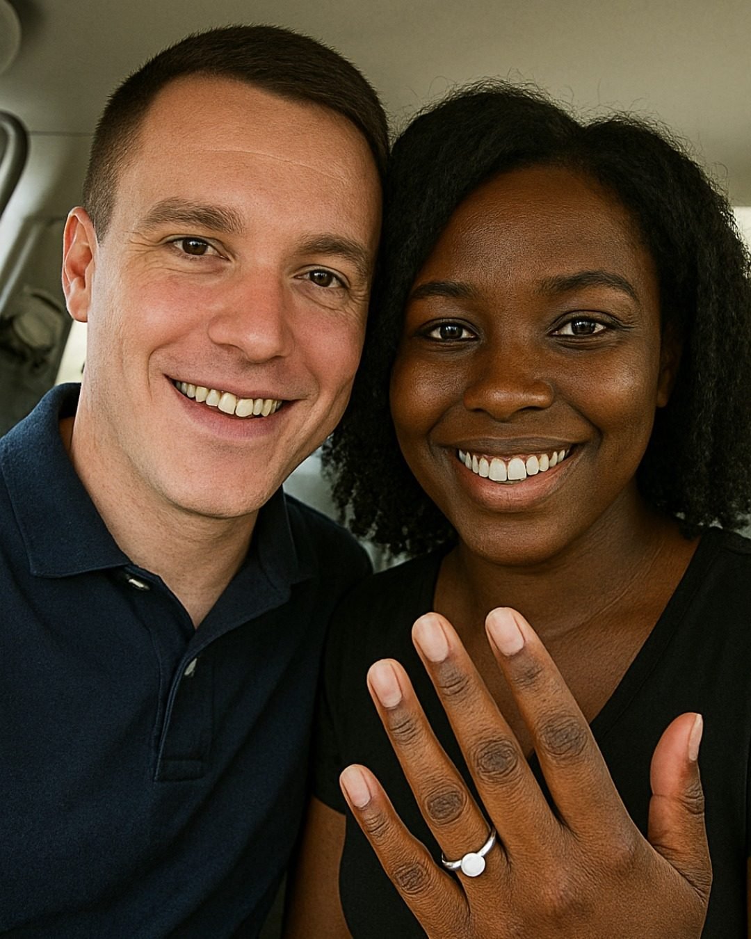 We were sitting in our usual spot, on the sofa, when he suddenly got down on one knee. My heart pounded as he held out a ring that sparkled almost as much as his eyes.