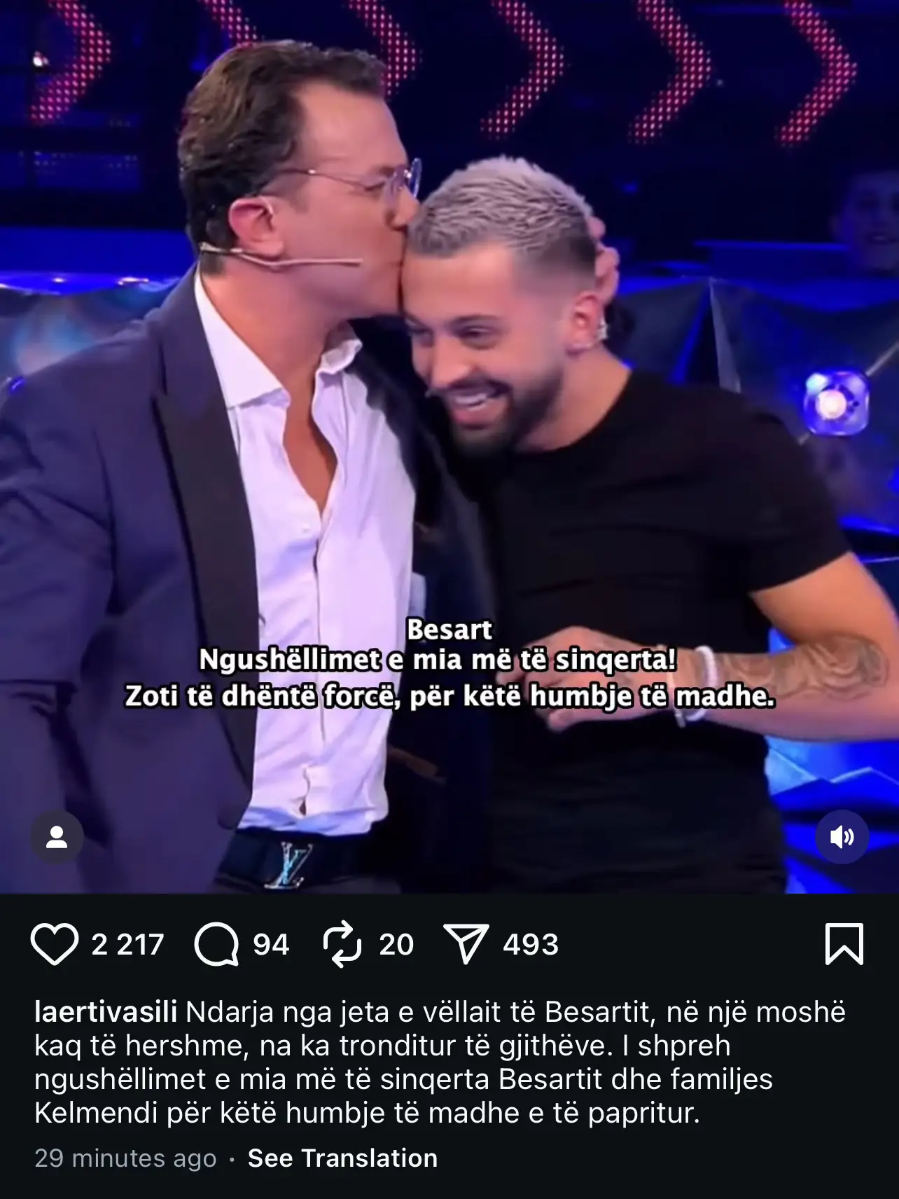 Lajmi i hidhur për ndarjen nga jeta të Eldion Kelmendit, vëllait të artistit Besart Kelmendi (Gjesti), ka prekur thellë opinionin publik dhe njerëzit e afërt me familjen. Ndër ta, ka reaguar edhe aktori i njohur Laert Vasili, i cili ka shprehur ngushëllimet për humbjen e parakohshme që goditi familjen Kelmendi.
