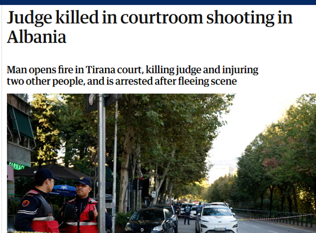 The Guardian e ka nisur artikullin duke shkruar se ‘Një burrë në gjyq hapi zjarr në një sallë gjyqi në kryeqytetin e Shqipërisë, Tiranë, të hënën, duke vrarë gjyqtarin dhe duke plagosur dy persona të tjerë, tha policia.