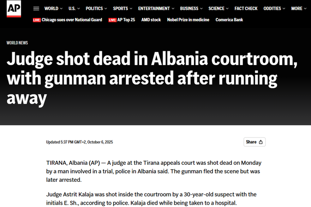 Associated Press shkruan; Një gjyqtar në gjykatën e apelit në Tiranë u qëllua për vdekje të hënën nga një burrë i përfshirë në një gjyq, tha policia në Shqipëri.