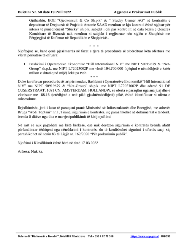 Këta do të garonin me bashkimin e kompanive “Hill International N.V” në pronësi të një shtetasi Hollandez por me administrator grekun, Ioannis Kirkinezis dhe “Net-Group” në pronësi të Valter Begaj, mik i ngushtë i Ervis Berberit.