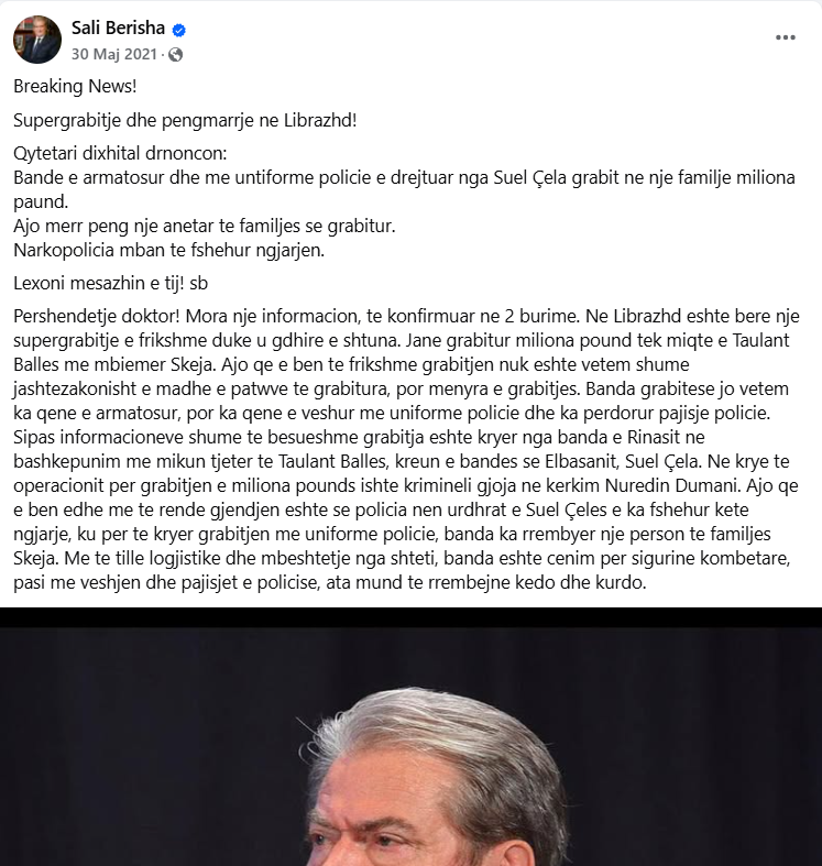 Por, pavarësisht se kjo ngjarje u zbulua nga SPAK, është denoncuar 4 vite më parë edhe nga kreu i PD-së, Sali Berisha. Në një postim në rrjetet sociale më 30 Maj të vitit 2021, Berisha denonconte vjedhjen e miliona paundësh në familjen Skeja nga një bandë e armatosur me uniformë Policie.