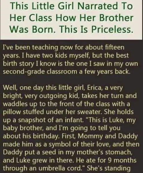 I have two kids myself, but the best birth story I know is the one I saw in my own second grade classroom a few years back.
