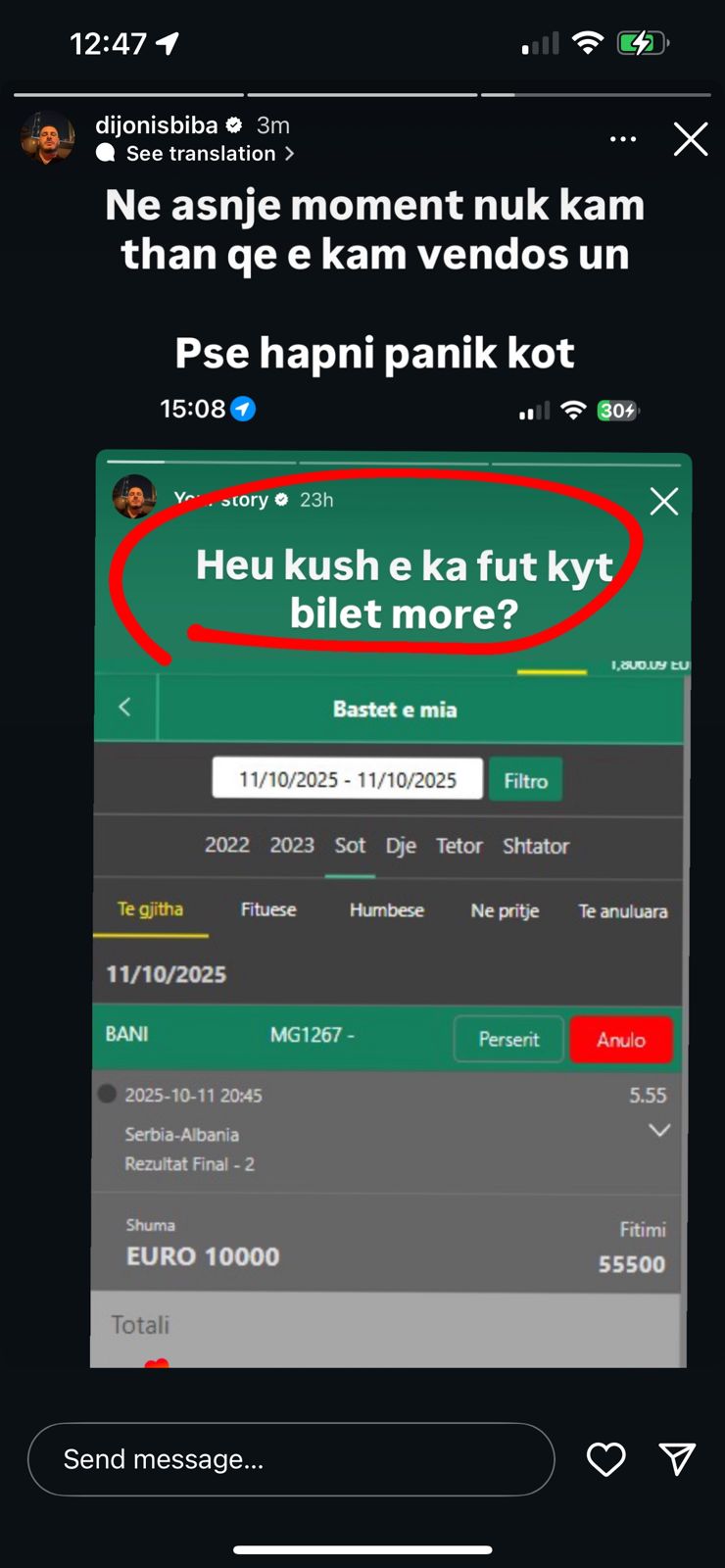 Pas publikimit të një bilete basti prej 10 mijë eurosh për ndeshjen Serbi–Shqipëri, në rrjetet sociale qarkulluan lajme se Dijonis Biba ishte arrestuar në lidhje me këtë rast.