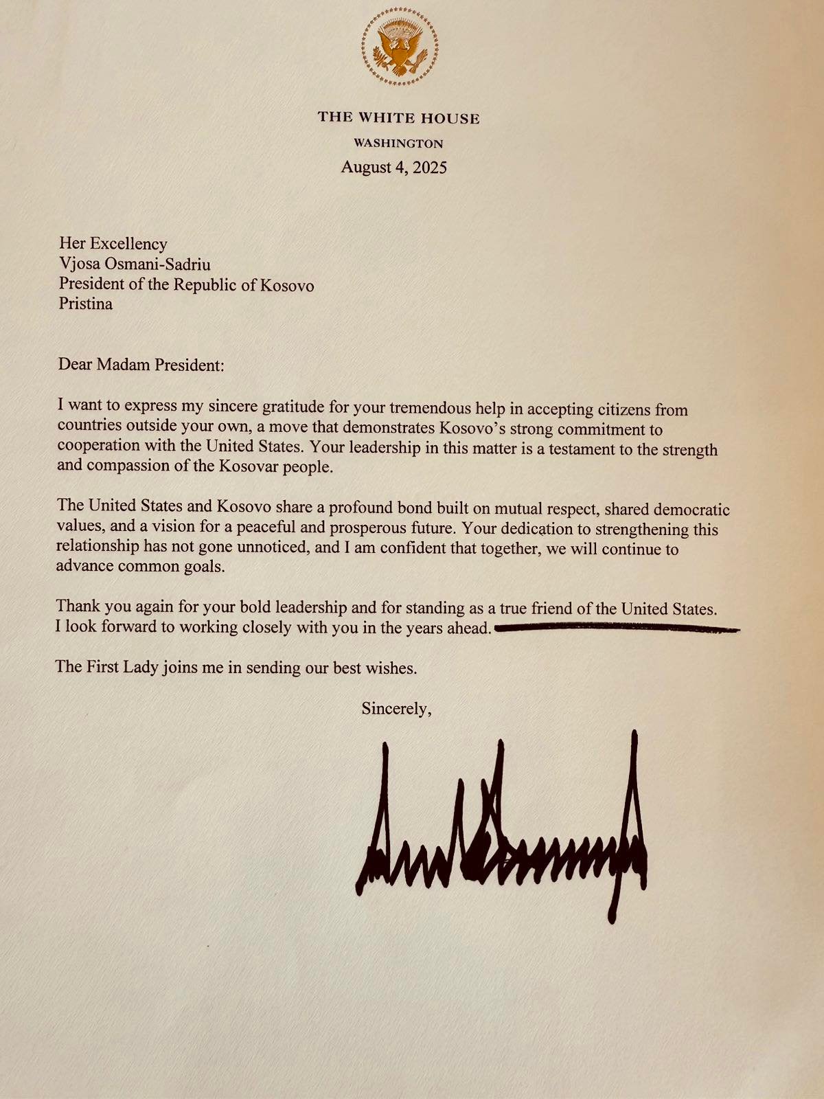 Dua të shpreh mirënjohjen time të sinqertë për ndihmën tuaj të jashtëzakonshme në pranimin e qytetarëve jashtë vendit tuaj – një veprim që dëshmon përkushtimin e fortë të Kosovës ndaj bashkëpunimit me Shtetet e Bashkuara. Udhëheqja juaj në këtë çështje është dëshmi e forcës dhe dhembshurisë së popullit të Kosovës.