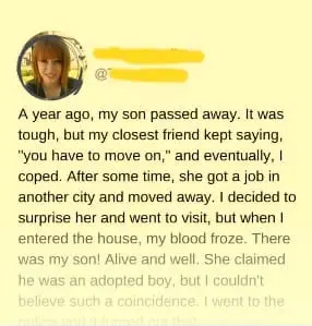 “I need to know if my son is still alive,” she told him, her hands holding her phone too roughly. “I think my friend’s adopted son might be my own.”