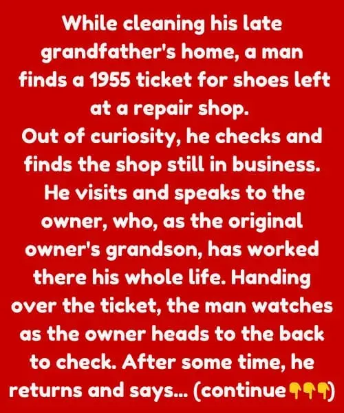 A man is cleaning out his grandfathers home after the grandfather passed away at 90. In one of the grandfathers old overcoats pockets he finds a ticket for some shoes that the grandfather had left to be repaired, dated from 1955. In curiosity the man checks online and is surprised to see that the shoe shop was still in business and is still at the same location.