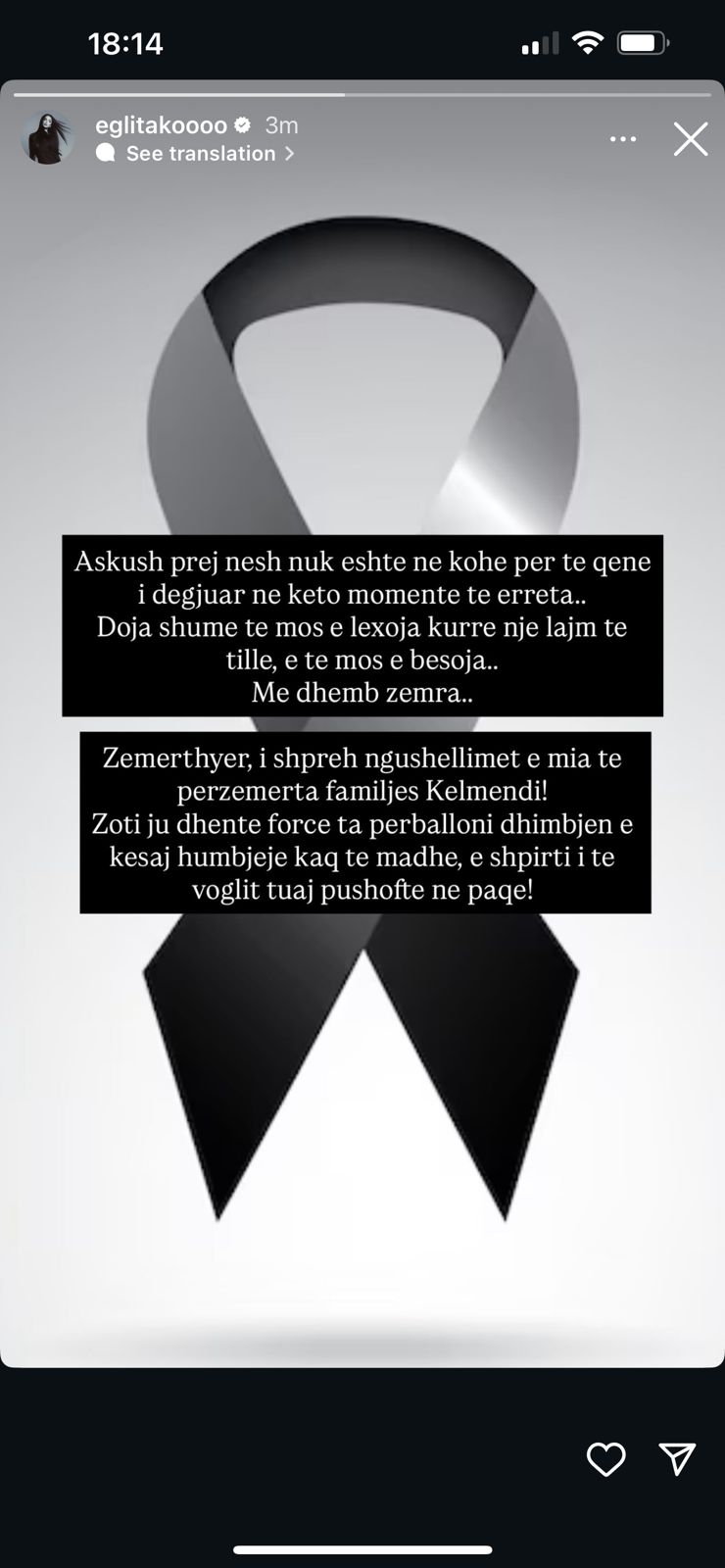 Reagimi i Eglit i është bashkuar dhjetëra mesazheve të tjera ngushëlluese nga figura të njohura të showbizit, të cilët janë solidarizuar me dhimbjen e familjes Kelmendi dhe vetë artistit Gjesti./Prive